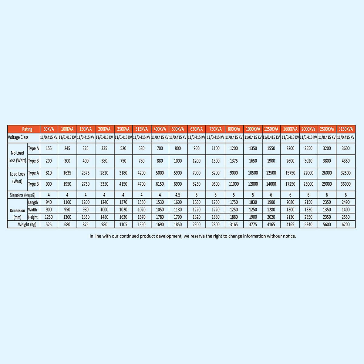 The transformers are designed, manufactured and tested in accordance with IEC 60076, ANSI C57.12, VDE 0537, BS-171 & HD428 standards. The Oil type Transformers range from 50 KVA to 5000KVA with primary voltage 11kV/33kV. The technical data are as follows: